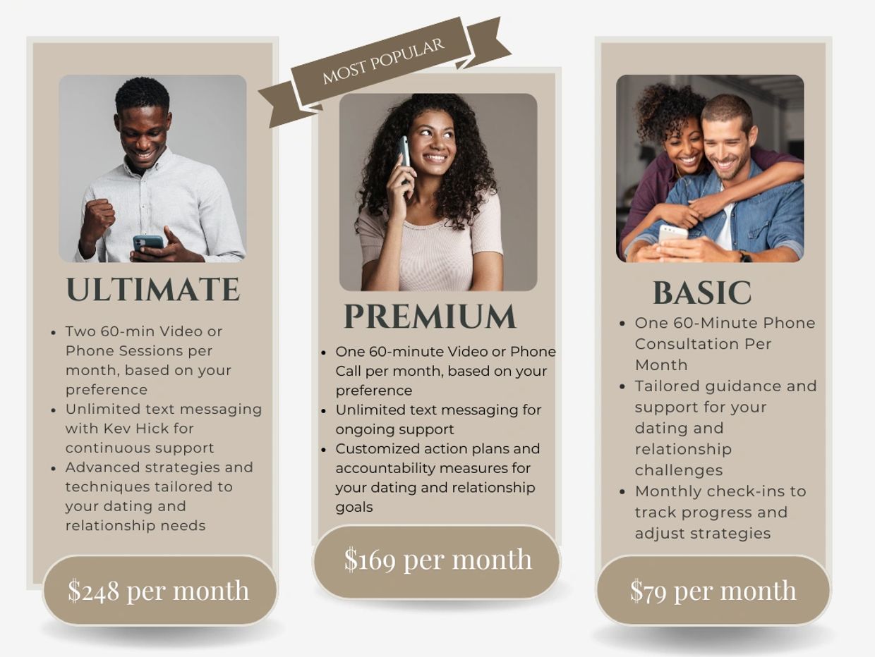 Introducing our newest texting service option: unlimited texting! This exclusive plan gives you 24/7 access to personalized dating, life, and relationship coaching right at your fingertips. Whether you need advice on navigating a tough conversation, making a life-changing decision, or simply want support during everyday challenges, you can text your coach anytime and get expert guidance. No scheduling, no waiting—just real-time answers to help you take control of your life and relationships. At just $95/month, this plan is perfect for anyone who values convenience, privacy, and tailored support whenever you need it.